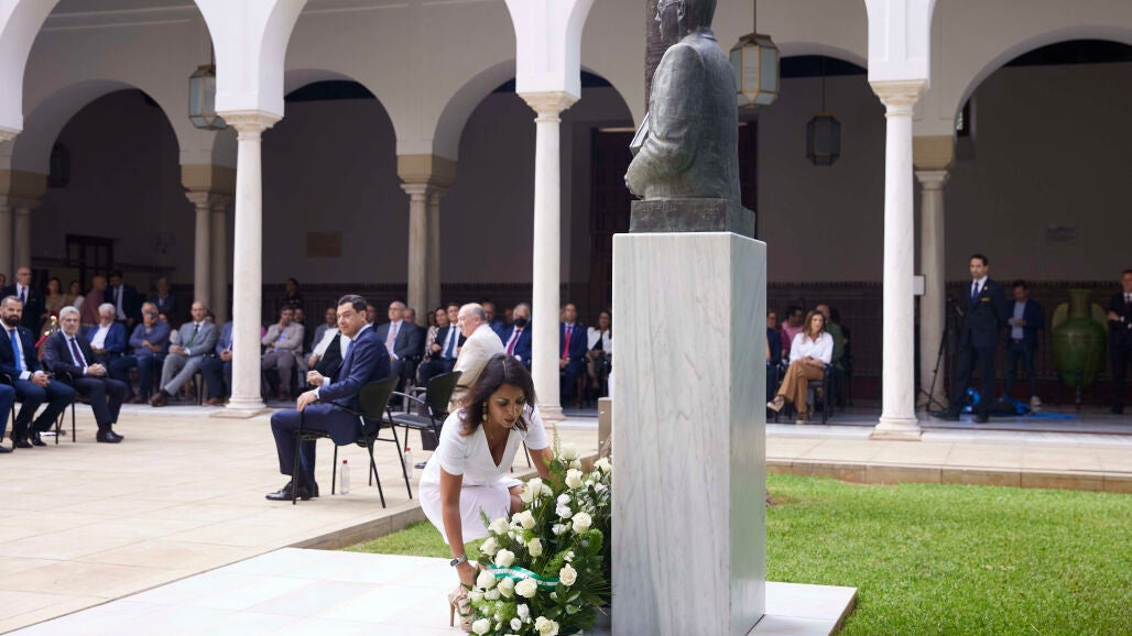 Este 5 de julio, el presidente, Juanma Moreno, junto a la presidenta del Parlamento de Andalucía, Marta Bosquet, han presidido el acto institucional en el que también han estado el nieto de Blas Infante, Javier Delmás, los miembros de la Mesa de la Cámara y distintas autoridades, además de todos los partidos políticos representados en la Cámara, excepto Vox, que nunca participa.