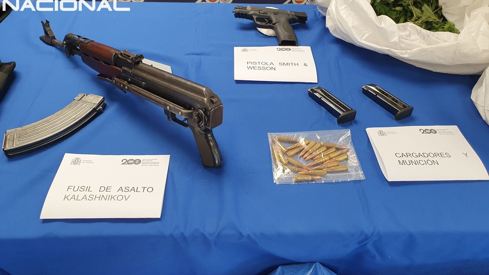 En los registros efectuados, autorizados con carácter urgente, los agentes han intervenido un total de 1.200 plantas de marihuana en diferentes fases de crecimiento, que una vez desbrozadas arrojaron un peso de casi 70 kilogramos; así como un fusil de asalto Kalashnikov AK-47 municionado y listo para su uso, una pistola también municionada y con el cargador de repuesto, 49 cartuchos de fusil de guerra, 29 cartuchos de arma corta, dos chalecos antibalas y guantes de corte, todo ello oculto en una de las viviendas configurada como "un auténtico búnker", según la Policía Nacional.