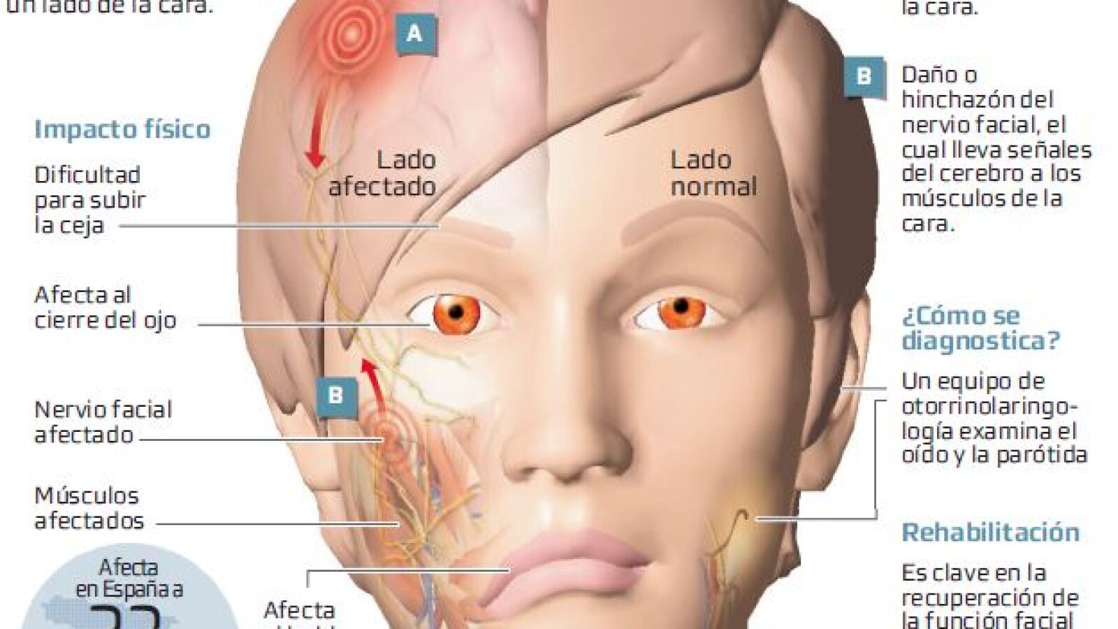 La parálisis facial es uno de los trastornos que además de las implicaciones físicas que pueden afectar al cierre del ojo, al habla, la facilidad para comer... «lleva también asociado un gran impacto psicológico, ya que incide directamente en la calidad de vida del paciente y en su relación con su entorno, produciéndole, en muchos casos, angustia y ansiedad», explica Carlos Martín Oviedo, otorrinolaringólogo especialista en parálisis facial del Equipo de Ortiz del Hospital La Milagrosa de Madrid. Por eso, la rehabilitación es una de las partes fundamentales para conseguir recuperar la función facial.