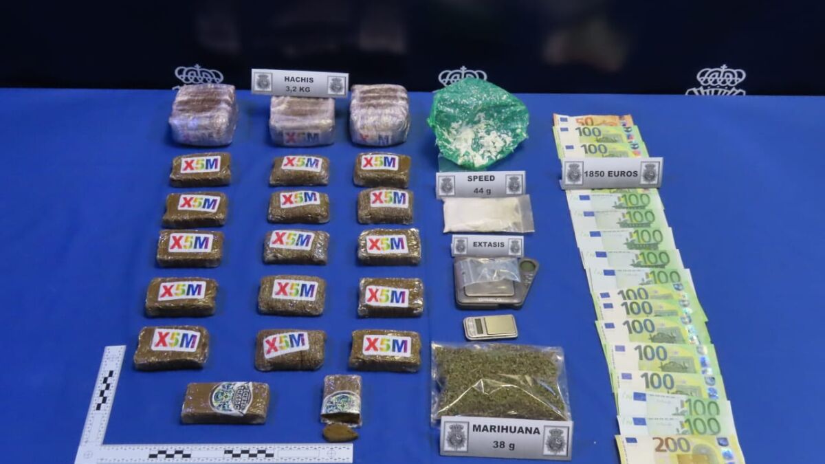 Durante el registro de su domicilio y de un pequeño local, se interviene más de tres kilos de hachís, 44 gramos de speed, 38 gramos de marihuana y1.850 euros en efectivo