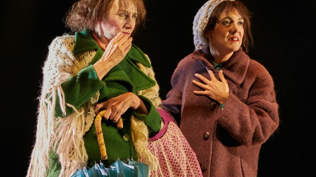 Pertinente y muy convincente recuperación, en clave teatral, de las dos Marías, dos mujeres reales a partir de las cuales el espectador podrá muy bien en esta propuesta advertir y entender la negrura en la que estuvo inmersa una parte de la sociedad civil en España después de la guerra. Maltratadas y humilladas por la vinculación de algunos de sus hermanos con el anarquismo, Maruja y Coralia se rebelaron contra el ambiente opresivo en el que tuvieron que sobrevivir durante la posguerra saliendo todos los días, con su colorida ropa y su capa de maquillaje, a pasear por Santiago de Compostela y a flirtear cómicamente con los estudiantes que poblaban las calles. En «Las dos en punto» –título que alude a la invariable hora a la que iniciaban su recorrido de 20 minutos–, la dramaturga Esther Carrodeguas ha elevado a la categoría de símbolos a estas dos mujeres urdiendo con ellas una suerte de lastimosa road-movie que combina muy bien la ironía y la poesía.