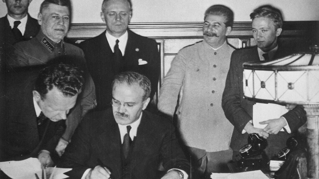 Los comunistas colocaron en Madrid un enorme cartel con el lema «No pasarán», pero no solo pasaron los fascistas en abril de 1939, sino que la URSS firmó un pacto con la Alemania nazi poco después. Desde septiembre de 1939 a junio de 1941, Stalin fue el principal aliado de Hitler gracias al pacto Ribbentrop-Molotov. Incluso el dictador soviético proporcionó materias primas al régimen nazi para su industria armamentística. A cambio recibió la parte oriental de Polonia, cuya población diezmó, Estonia, Letonia, Lituania, Besarabia y tuvo el campo libre con Finlandia. Hitler ofreció a Stalin un imperio, y lo aceptó.