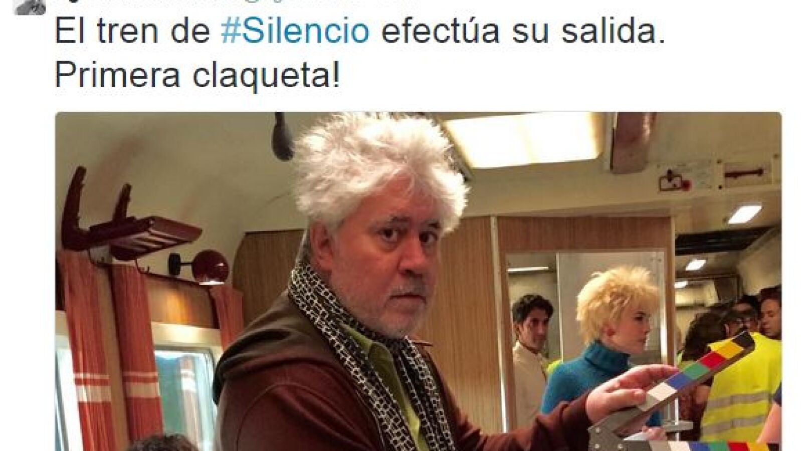 Un vagón de tren, y en él los actores Daniel Grao y Adriana Ugarte -con peluca rubia-; es la primera imagen del rodaje de “Silencio”, la nueva película de Pedro Almodóvar, difundida hace unas horas por su hermano Agustín a través de Twitter. En primer plano aparece el propio director posando con la claqueta.