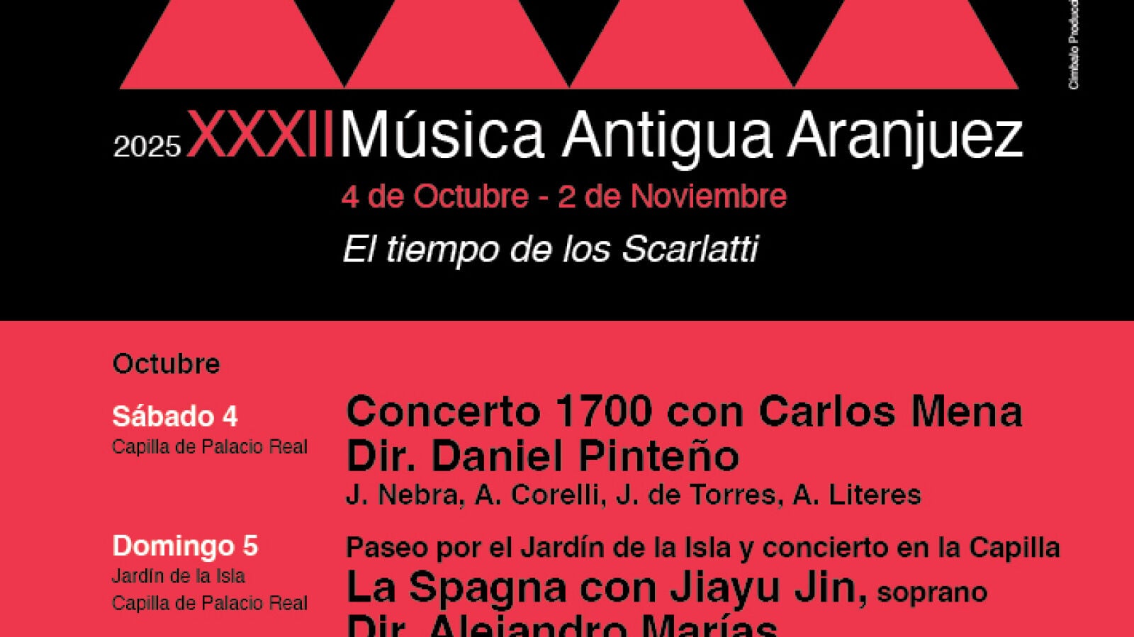 El Festival de Música Antigua de Aranjuez alcanza su XXXII edición tras una trayectoria desarrollando la labor de difusión y divulgación de la música antigua, la música patrimonial y su vinculación con la ciudad, la historia, la arquitectura y el paisaje del Real Sitio y Villa de Aranjuez. Esta edición conmemora a dos grandes maestros de la música: el 300 aniversario de Alessandro Scarlatti y el 340 aniversario de Domenico Scarlatti, quien estuvo al servicio como maestro de música de la Reina Bárbara de Braganza.