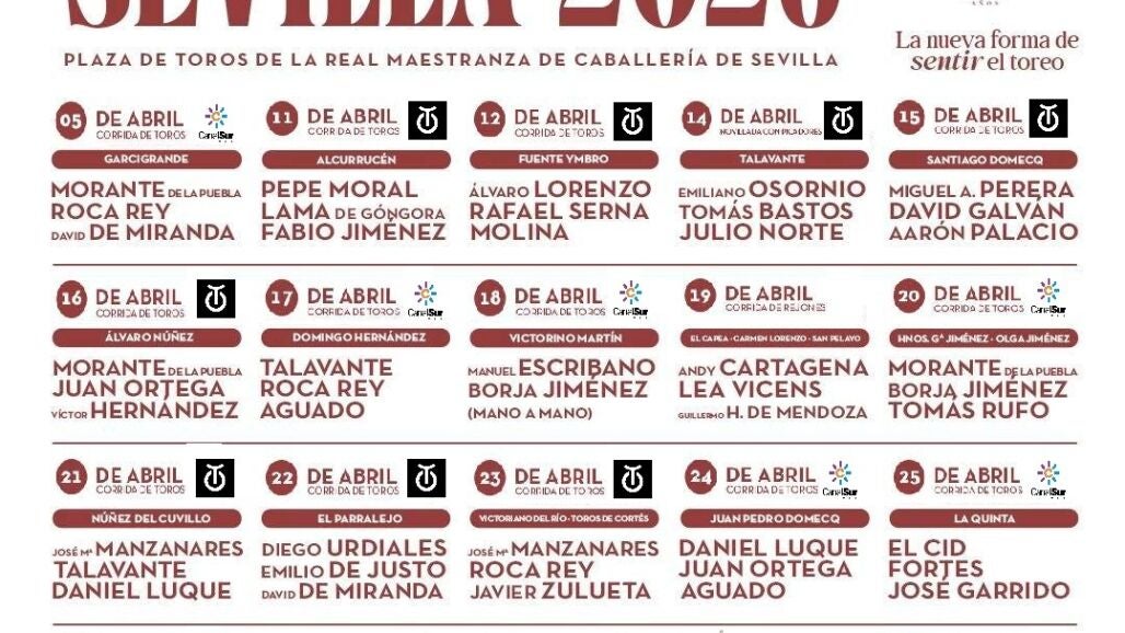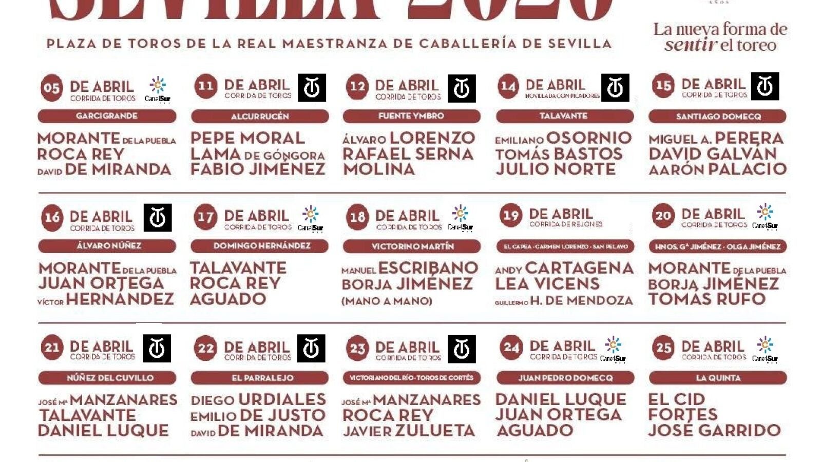 Sin embargo, el plato fuerte llegará a partir del jueves 16, con una cita que paralizará Sevilla: el arte de Morante de la Puebla y Juan Ortega frente a la frescura de Víctor Hernández, en una tarde que será retransmitida simultáneamente por OneToro TV y la televisión valenciana À Punt. El broche de oro televisivo de la semana lo pondrá Canal Sur el viernes 17, con un cartel de "No hay billetes" encabezado por el fenómeno Roca Rey, escoltado por el magisterio de Alejandro Talavante y la clase de Pablo Aguado.