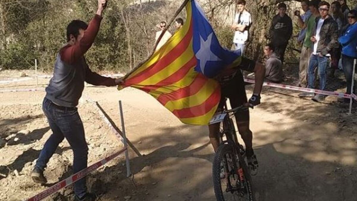 Durante la carrera una persona colocó al ciclista una "estelada"en la cara, como si fuera un capote, mientras en la otra mano llevaba un palo a modo de banderilla