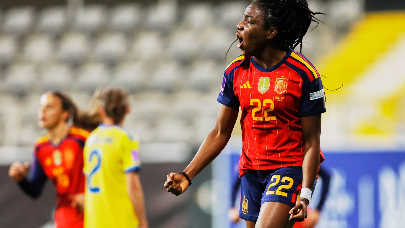 La selección española tuvo que esperar hasta el minuto 44, cuando una falta botada por Salma Paralluelo desde tres cuartos de campo encontró la cabeza de Edna Imade en el corazón del área para hacer el 0-1. Ya en el añadido, Lucía Corrales se sacó de la manga un disparo de media distancia que tocó el larguero y se metió en la portería de Keliushyk para el 0-2, su primer tanto con España.