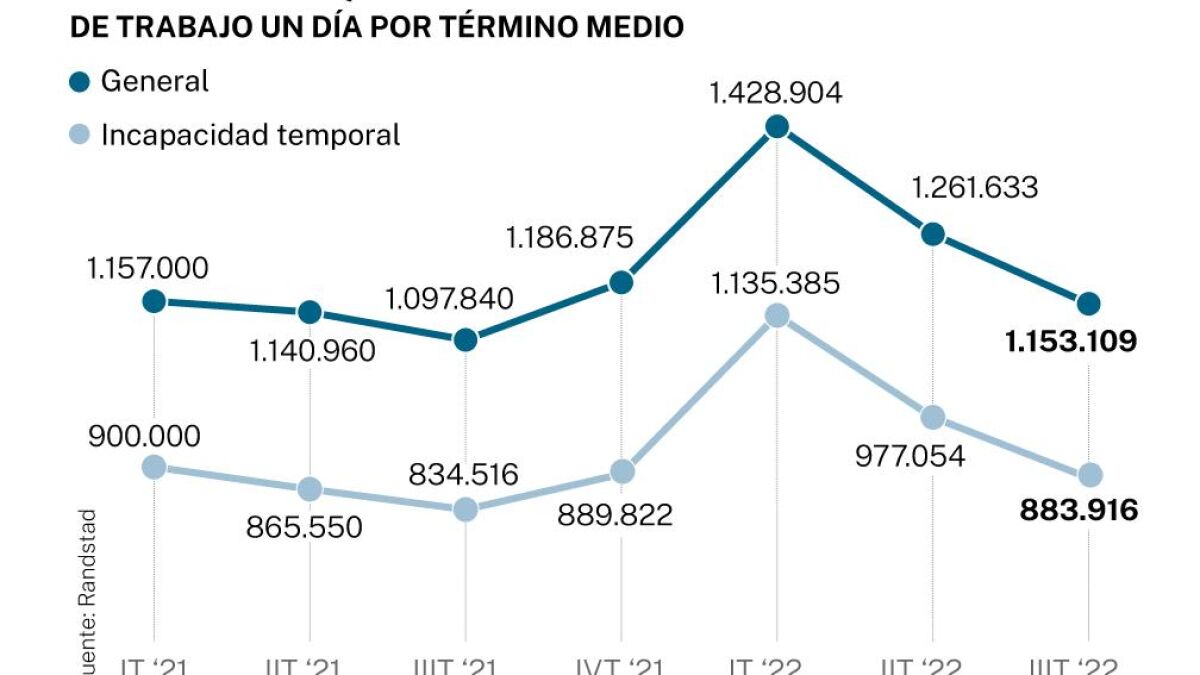 El absentismo laboral supone un problema para las empresas españolas, «con un impacto directo sobre la productividad y los costes empresariales, lastrando asimismo su competitividad», advierte Randstad. Esta situación provocó que en nuestro país se perdieran el 5,6% de las horas pactadas durante el tercer trimestre del año, cuando la jornada semanal acordada era de 35,3 horas, según el INE. Un año antes, en el tercer trimestre de 2021, la tasa se situaba en el 5,5%, es decir, las empresas han experimentado un incremento de 0,1 puntos porcentuales del absentismo laboral en el último año, con los costes laborales que ello conlleva. En concreto, entre julio y septiembre de 2022, el coste laboral de las empresas se situó en 2.754,75 euros por trabajador.