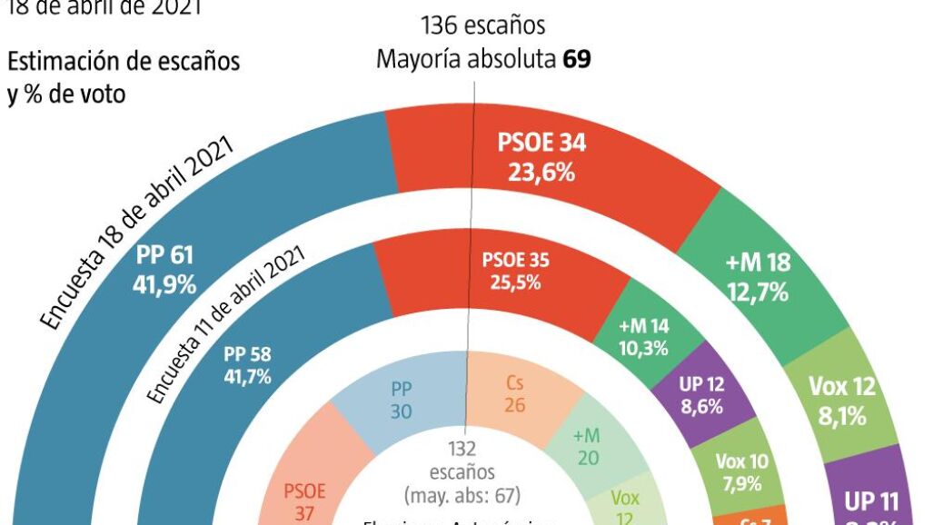 Isabel Díaz Ayuso se consolida como la fuerza más votada el próximo 4 de mayo. El PP ganaría los comicios con el 41,9% de los votos y 1.374.239 electores. Doblaría su actual representación en la Asamblea, con hasta 61 escaños, y se quedaría a ocho diputados de alcanzar la mayoría absoluta. La fórmula del éxito de Díaz Ayuso es su capacidad de atraer votantes de una forma transversal.