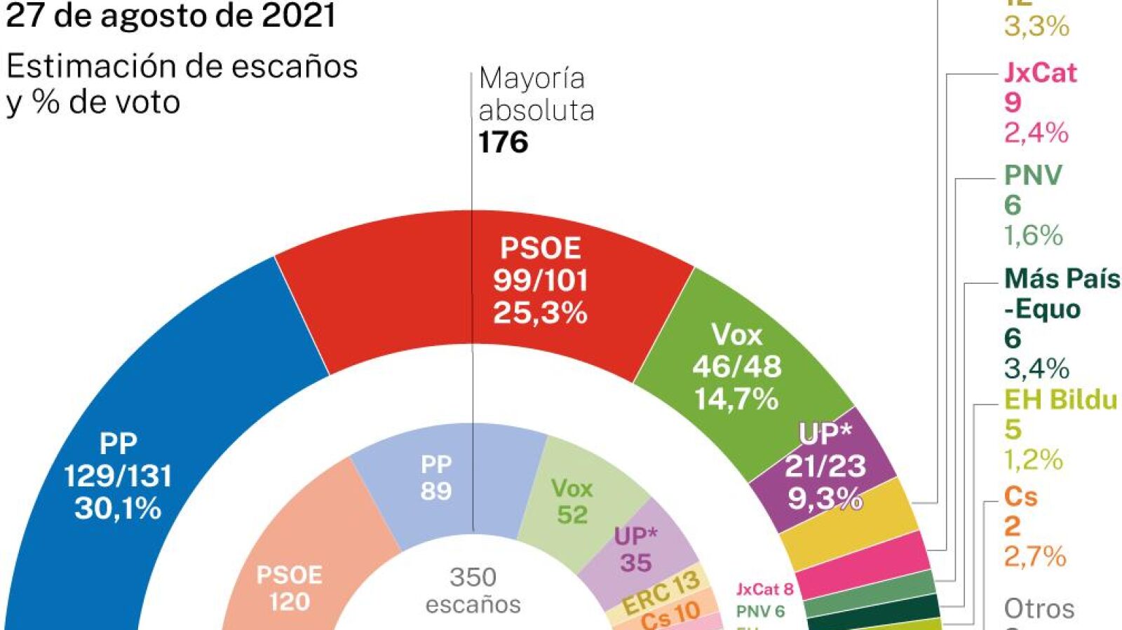 En septiembre, tras la Diada, debería retomarse la negociación bilateral entre el Gobierno de la Nación y la Generalitat. Los de ERC mantienen el ruido secesionista, pero desde una visión más pragmática en la gestión. Es ahí donde quieren marcar la diferencia con la etapa anterior, pero las encuestas reflejan que la radicalidad de Junts sigue arrastrando al movimiento independentista. PNV y EH Bildu mantendrían el reparto de votos que deja a los nacionalistas vascos sólo un escaño por encima de los abertzales.