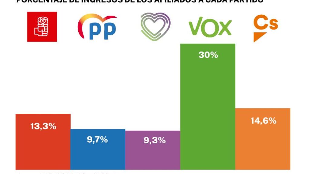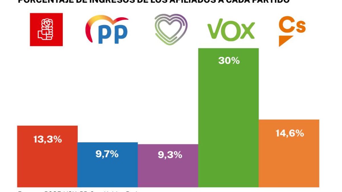 Las cuentas publicadas por los partidos políticos este mes de agosto reflejan que la mayor parte de sus ingresos no provienen de las cuotas de sus afiliados, sino de las subvenciones públicas. Así, el PSOE y el PP solo reciben un 13,3 y un 9,7 por ciento de sus recursos de sus respectivos afiliados. El partido que mayor porcentaje ingresó por cuotas es Vox, con casi un 30 por ciento, mientras que Podemos es el que menos financiación tiene de sus seguidores, solo el 9,3 por ciento. Según estos datos, recogidos por Europa Press, el Partido Socialista es el que cuenta con un presupuesto mayor. En 2021 tuvo un total de 79,3 millones de ingresos de la gestión ordinaria. Casi un millón más que el año anterior.