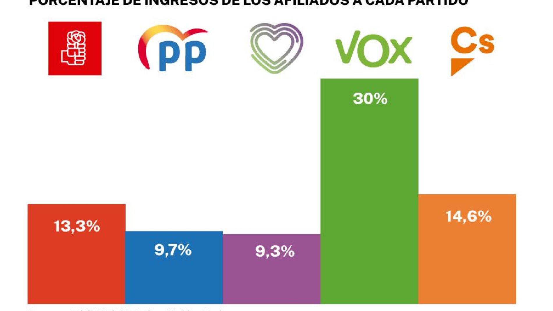 En el extremo contrario se encuentra Podemos, que solo ingresa por cuotas de afiliados el 9,3 por ciento de su presupuesto de ingresos, es decir, 1,33 millones de euros de los 14,28 millones que ingresó Podemos para gestión ordinaria en 2021. Lo que supone un aumento con relación a los 945.061 euros que registraron en 2020. Las aportaciones de los cargos públicos ascienden a 1,85 millones y tuvieron 2.190 euros de «donaciones y legados». La financiación de origen privado suma un total de 3,18 millones frente a los ingresos de origen público que supusieron 11,1 millones, de los que 10,59 millones fueron de subvenciones anuales para gastos de funcionamiento; 296.570 euros de aportaciones de grupos institucionales y 214.236 euros para gastos de seguridad.
