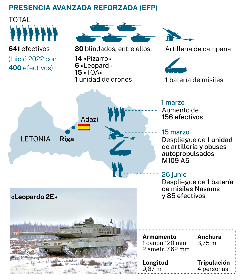 El Ejército de Tierra participa en esta misión desde 2017. Forma parte de un batallón multinacional de unos 2.000 efectivos liderado por Canadá y hasta comienzos de año aportaba unos 400 militares y 80 blindados, entre ellos carros de combate «Leopard» y «Pizarro», al contingente desplegado en la localidad de Adazi.