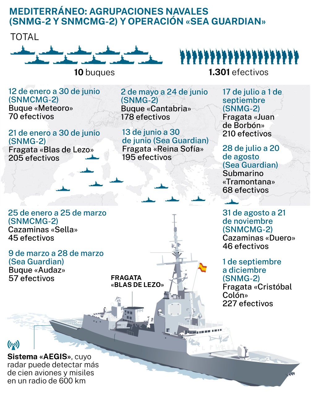 La Armada lideraba desde junio de 2021 la SNMCMG-2 con el «Rayo», al que sustituyó el «Meteoro» en enero durante otros seis meses más. Pero a partir del primer mes del año, Defensa adelantó y reforzó los despliegues ya previstos. Así, en enero, la «Blas de Lezo» se integró en la SNMG-2 (seis meses) y el «Sella» (dos meses) en la SNMCMG-2. Y desde entonces, todos los meses al menos un buque español ha patrullado el Mediterráneo. Tras estos llegó el «Audaz», que se sumó en marzo a la operación «Sea Guardian», a la que se unió la «Reina Sofía» en junio. Antes, en mayo, el «Cantabria» se desplegó en la SNMG-2 y en julio fue relevado por la «Juan de Borbón». Los últimos en desplegarse fueron el submarino «Tramontana», el cazaminas «Duero» y la fragata «Cristóbal Colón», que acaba de regresar.