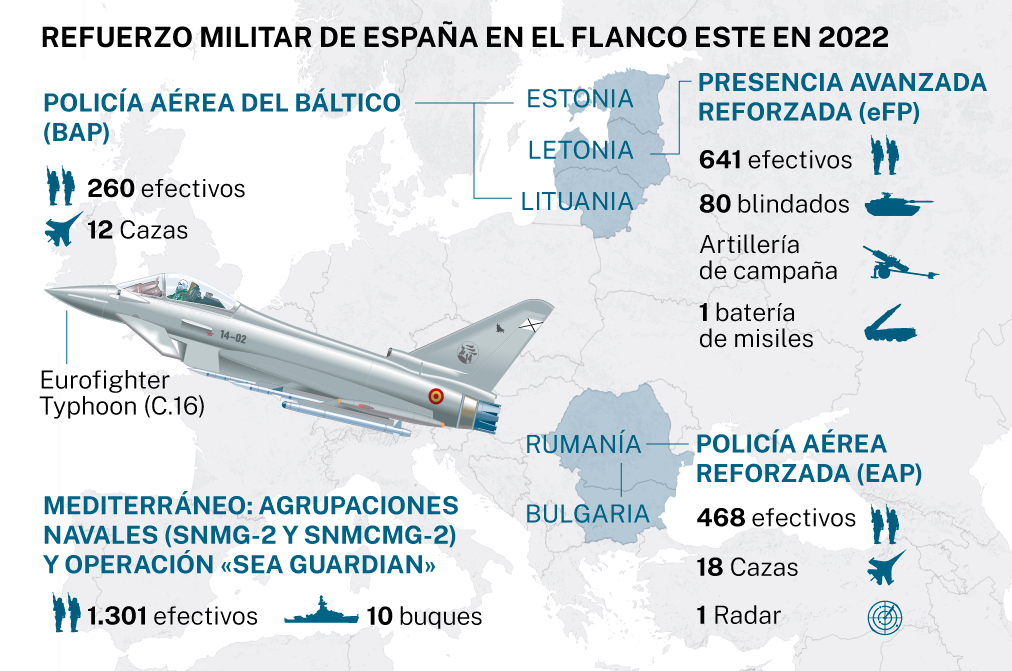 En total, desde que empezó el conflicto, los dos Ejércitos y la Armada han contribuido a garantizar la seguridad aliada con 30 cazas, diez buques, armamento pesado y más de 2.200 militares extra. Y lo han hecho en las agrupaciones navales permanentes de la OTAN en el Mediterráneo, en la Presencia Avanzada Reforzada de Letonia y en las misiones de Policía Aérea en el Báltico y el Mar Negro.