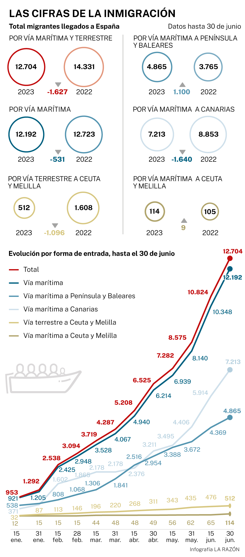 Pero volviendo al año en curso y a este primer semestre, de los 12.704 migrantes que alcanzaron nuestro país, la práctica totalidad lo hicieron por vía marítima a las costas: 12.192 (el 96%) llegaron en pateras, cayucos o motos de agua –incluso a nado a las ciudades autónomas–. Solo en junio entraron por vía marítima a las costas españolas 4.052 personas (un tercio del total), frente a las 1.926 de mayo. En comparación con el mismo período de 2022, la reducción es de apenas 531 personas.