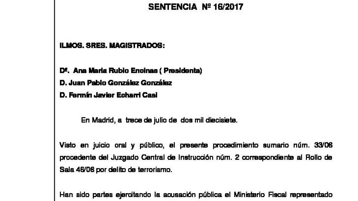 La condena impuesta son 210 años de cárcel por 14 delitos de asesinato terrorista intentado, en su modalidad agravada, por los policías heridos, y 310 años por otros 31 delitos de asesinato terrorista intentado, a lo que se suma una pena de 15 años por estragos terroristas en concurso con tenencia de explosivos.