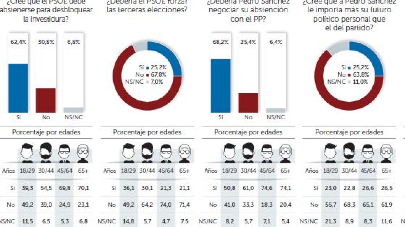 Encuesta NC Report. El 62,4 por ciento de los electores socialistas exige a Pedro Sánchez que facilite la investidura de Mariano Rajoy. Dos de cada tres reclaman a su secretario general que bajo ningún concepto fuerce unas terceras elecciones. El 66 por ciento aún confía en una maniobra de los barones más críticos que permita poner fin al bloqueo