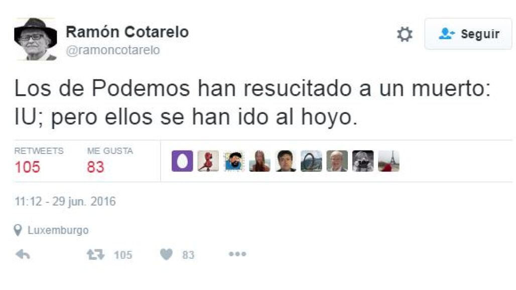 Cotarelo tiene claro que una de las razones de la caída de Podemos fue su pacto con IU. Así lo destaca en uno de sus tuit: “Los de Podemos han resucitado a un muerto: IU;