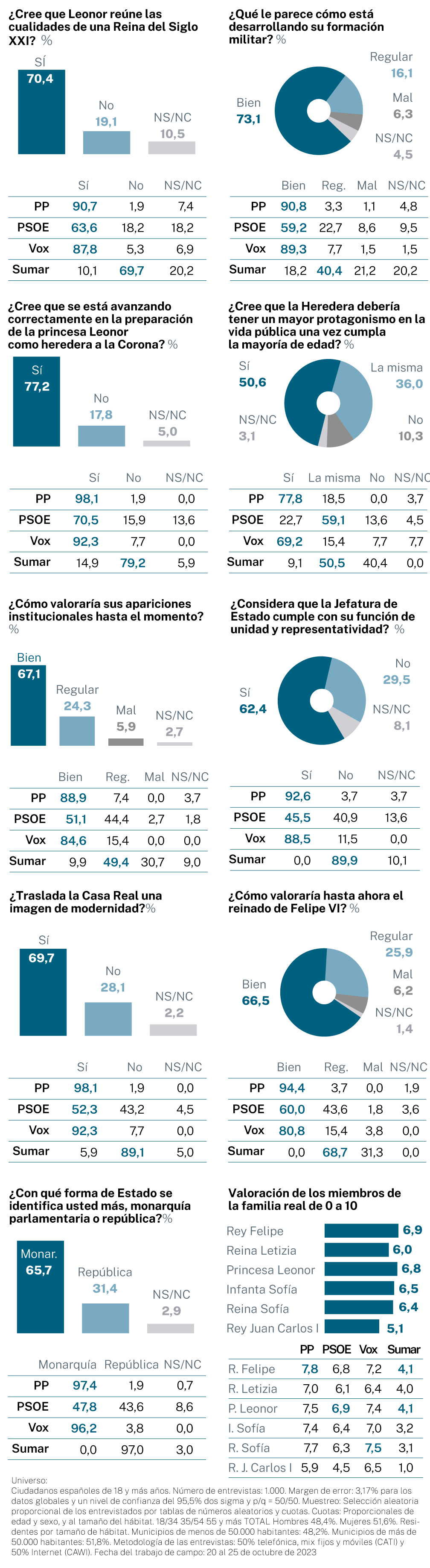 La principal responsabilidad que asumirá Leonor a partir de hoy es la de estar lista para reinar en caso de que Felipe VI falleciera o sufriera una incapacidad. Una amplia mayoría –siete de cuatro encuestados– asevera que está preparada frente a un 19,1% que opina lo contrario y un 10,5% que ni sabe ni contesta. Los votantes de todas las formaciones políticas –excepto Sumar– dan un voto de confianza a la Heredera. Los electores del PP son los más optimistas en cuanto a las cualidades de Leonor, un 90,7% considera que está preparada para asumir la Jefatura del Estado frente a 1,9% que no lo cree. En cuanto a los votantes del PSOE también la mayoría tiene fe en la primogénita de los Reyes, un 63,6% frente a un 18,2%. En cuanto a los electores de Santiago Abascal una amplia mayoría del 87,8% cree que está bien formada para reinar en tiempos modernos frente a un 5,3% que no lo piensa. Entre quienes votan a Sumar, formación abiertamente republicana, el sondeo refleja su rechazo a la figura de Leonor ya que solo convence a uno de cada diez.