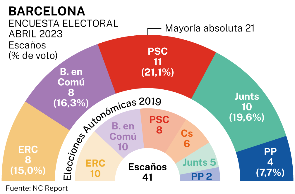 Golpe al tablero en Barcelona. Los socialistas estarían en condiciones de conseguir uno de sus objetivos en estas elecciones. El PSC se convertiría en la fuerza más votada, por delante de Junts, con 11 escaños. Xavier Trías logra doblar la representación que los postconvergentes consiguieron hace cuatro años, pero estos 10 asientos no le aseguran el bastón de mando. Quien deberá cederlo es la actual alcaldesa, Ada Colau, que arrastra un importante desgaste y sería ahora la tercera opción con ocho ediles; los mismos que conseguiría ERC.