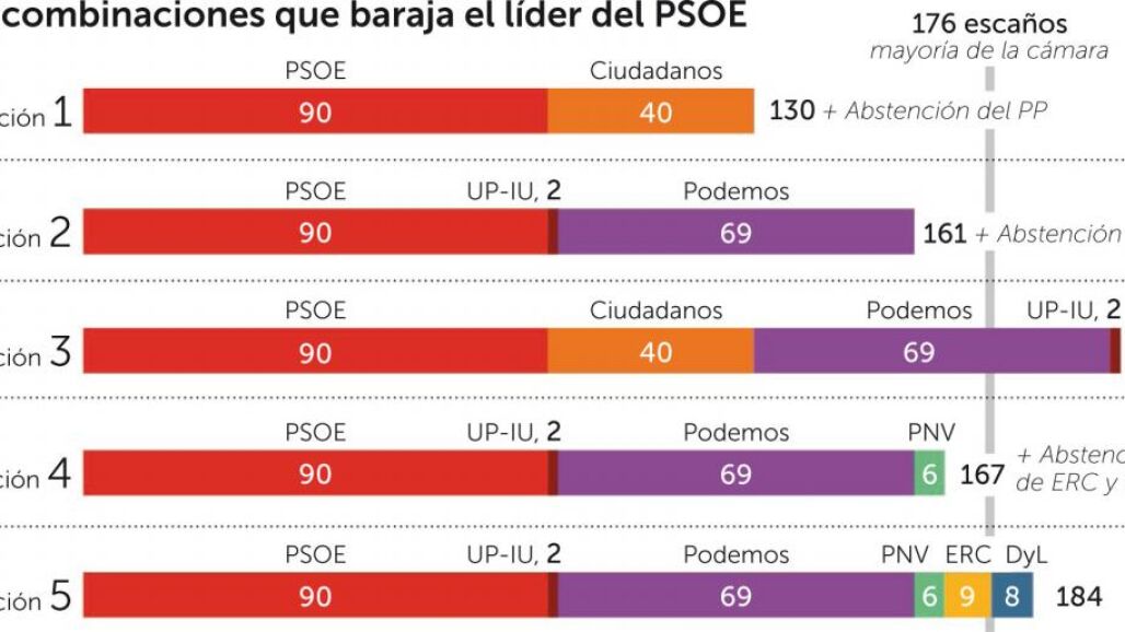 Granjearse el apoyo de Podemos permitiría al PSOE salvar el primer obstáculo hacia la investidura. No obstante, este aval es visto con desconfianza por distintos sectores del partido, que entienden que esta alianza sería un «suicidio» para la formación y llevaría aparejada la desaparición de sus siglas. Ni siquiera aunque el PSOE sumase a esta alianza a los nacionalistas del PNV le saldrían los números, porque sus 167 «síes» se enfrentarían a los 179 «noes» de PP, Ciudadanos y los independentistas. Sólo con la abstención de ERC (9) y Democracia y Libertad (8) podría salvar la diferencia, sin embargo, la opción de contar con el apoyo tácito de los soberanistas es inasumible para el partido y para el propio Sánchez, cuyas «convicciones» no le permitirían rubricar este pacto.