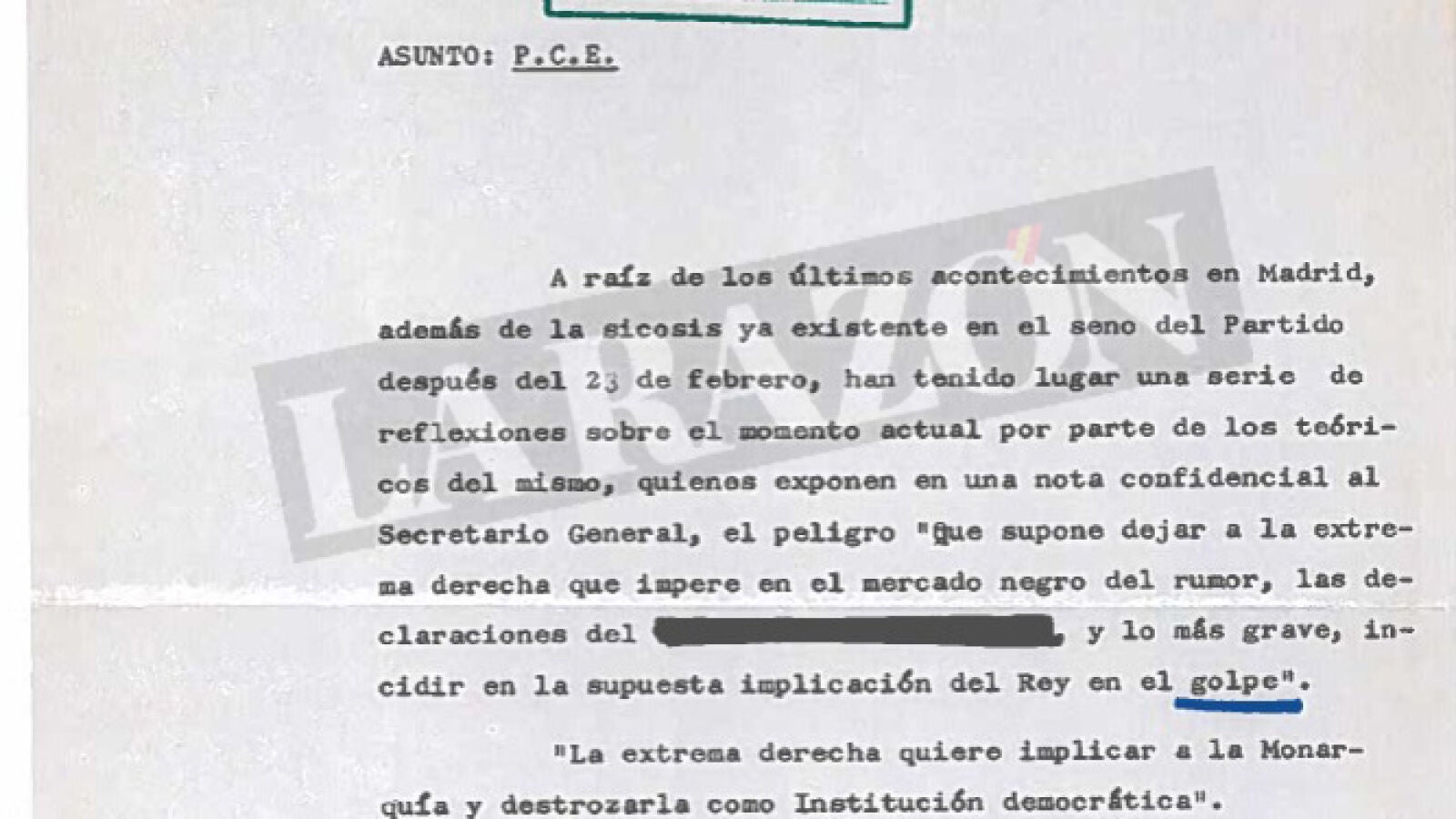 El Partido Comunista de España avisó, en una nota interna desclasificada, de que la extrema derecha quería "implicar a la Monarquía y destrozarla como institución democrática" tras el intento de golpe de Estado del 23F de 1981.