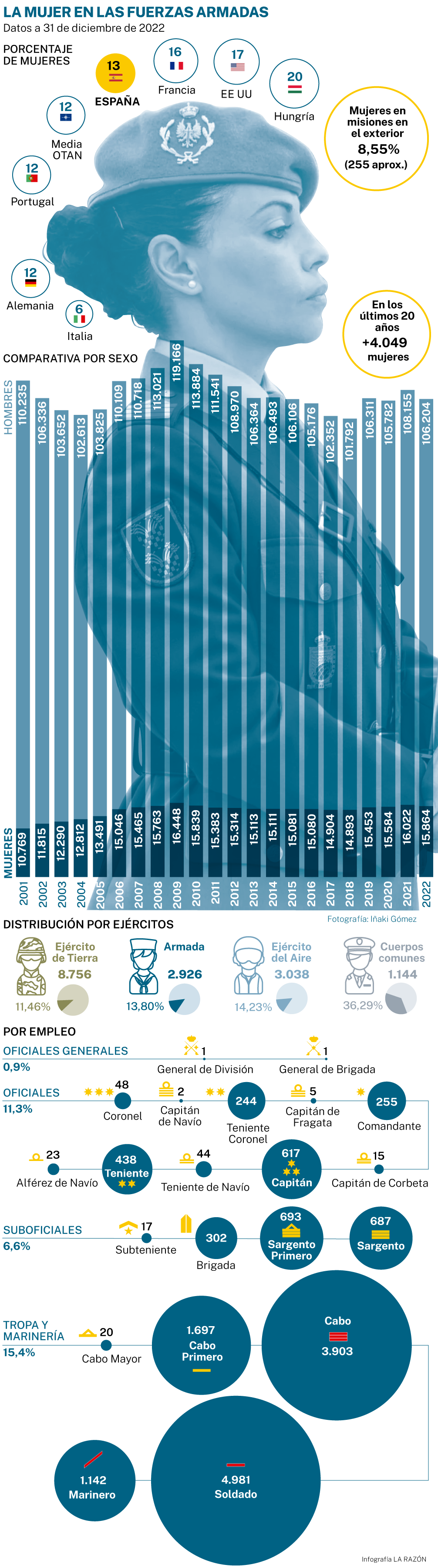 Al menos por el momento se ha superado la barrera del 12 por ciento (desde ese año el porcentaje ha oscilado entre el 12,02 y el 12,9) y se ha alcanzado el tan deseado 13 por ciento, tal y como se desprende de las últimas estadísticas del Observatorio militar para la igualdad entre mujeres y hombres en las Fuerzas Armadas (con datos a 31 de diciembre de 2022), a las que ha tenido acceso este periódico.