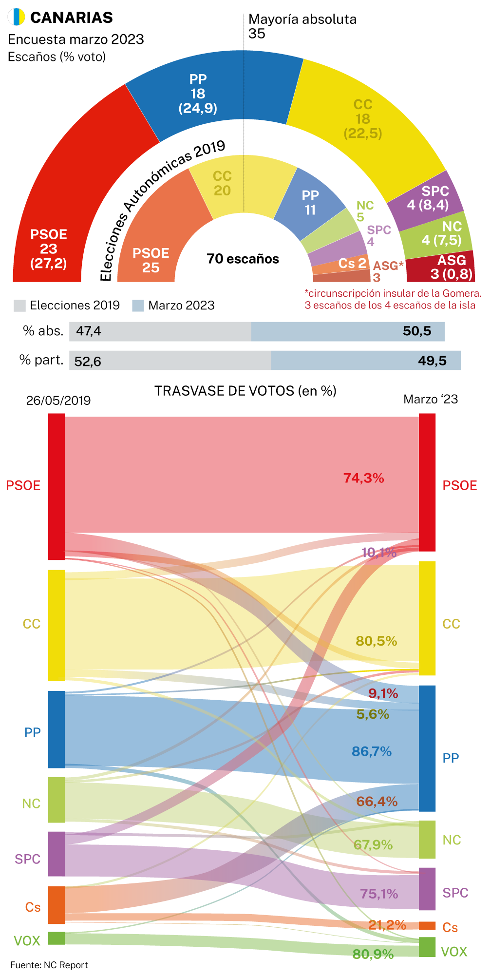 En concreto, Nueva Canarias perdería un asiento en el parlamento regional y se quedaría con cuatro escaños frente a los cinco de 2019, convenciendo al 7,5% de los votantes. Los otros dos socios de gobierno, por su parte, mantendrían el mismo apoyo. Así, Podemos igualaría el resultado de las últimas autonómicas con cuatro escaños y prácticamente el mismo porcentaje de voto, un 8,4%. Por último, la Agrupación Socialista Gomera también recibiría un apoyo similar, del 0,8%, es decir 3 escaños. Por lo tanto, la reedición de este pacto no sería posible, ya que sumarían 34 y se quedarían a uno de los 35 para la mayoría.