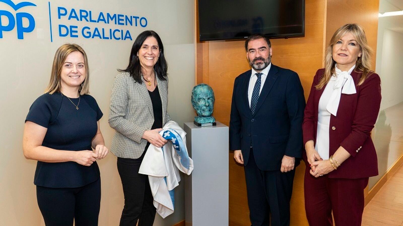 La ‘inauguración’ del busto tuvo lugar al término de una votación celebrada en la sesión plenaria de la Cámara autonómica. En el acto participaron la secretaria general del PPdeG, Paula Prado; el portavoz parlamentario, Alberto Pazos; la viceportavoz segunda y diputada por Lugo, Cristina Sanz; y Sandra Vázquez, presidenta del PP de Vilalba y recientemente designada al frente de la Fundación Manuel Fraga, además de directora xeral de Relacións Parlamentarias.