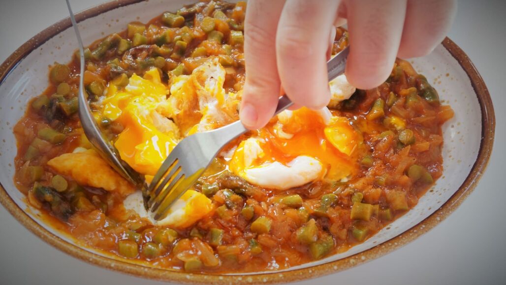 Ponemos el guiso de espárragos a la flamenca, terminamos con los huevos fritos y a comer con mucho pan para mojar.