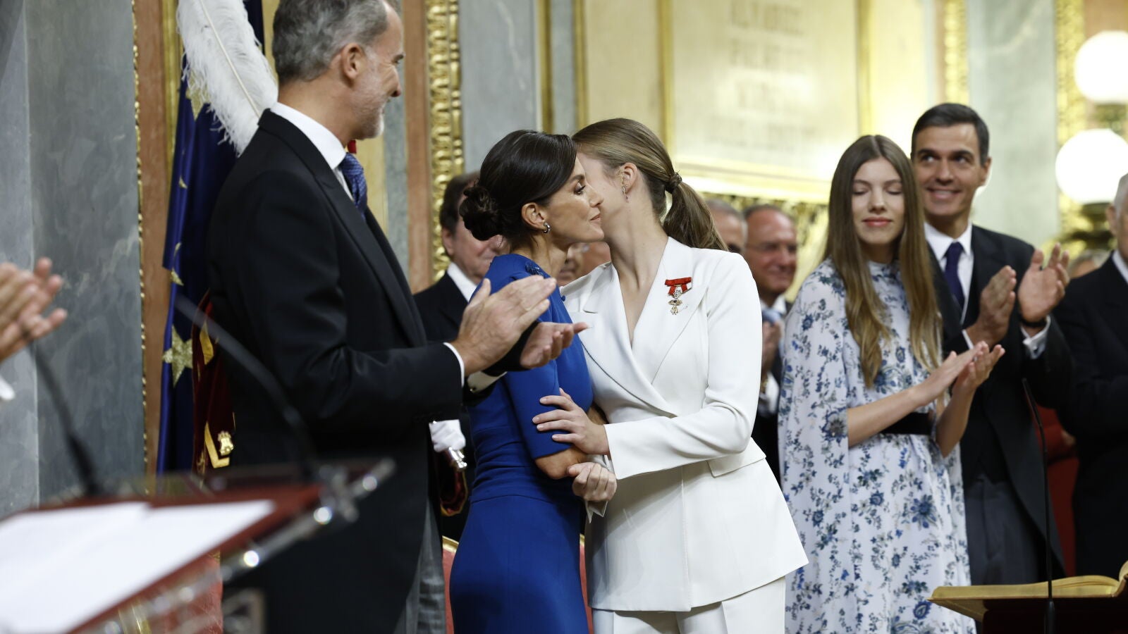 La Reina Letizia siempre está atenta a cada uno de los movimientos de sus hijas en público. Y hoy, en el día de la Jura de la Constitución de Leonor de Borbón, no podía ser menos. Además de estar atenta a cada paso y orgullosa durante el juramento de su hija, la Princesa de Asturias, en el Congreso de los Diputados, antes de la foto la Reina Letiziaha colocado bien la coleta de la Princesa, que en el trayecto del coche desde Zarzuela a la carrera de San Jerónimo, se había despeinado un poco. A lo largo del acto le ha colocado bien el pelo en dos ocasiones más, y una de ellas también su padre el Rey Felipe.