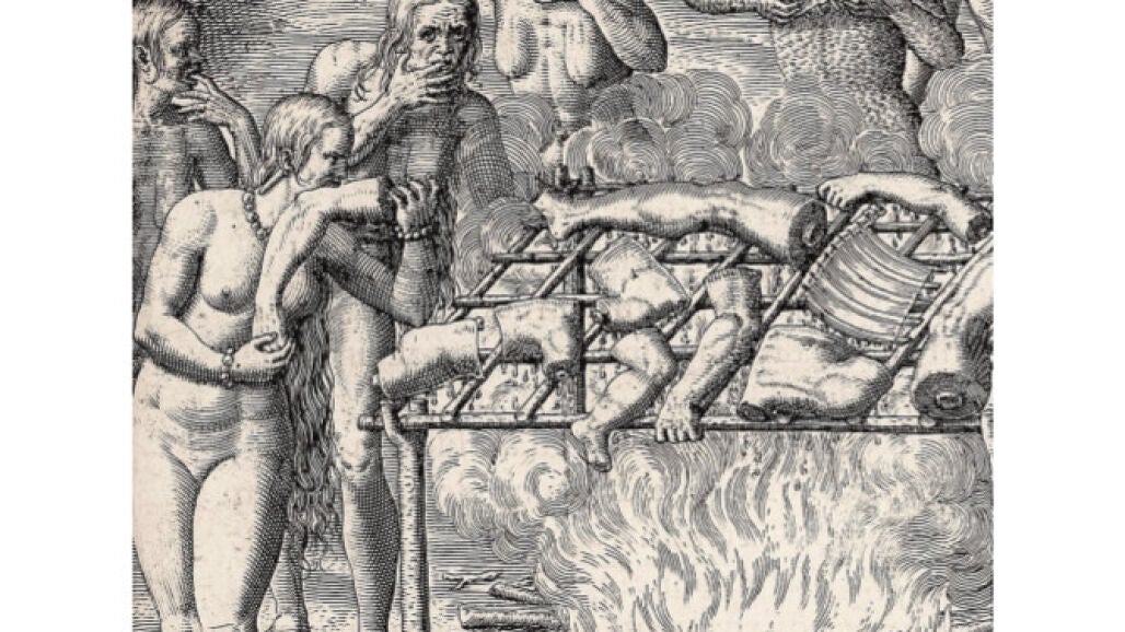 El rico hacendado Cristóbal de Guzmán de Puerto Rico fue asaltado una noche por indios que asaltaron su residencia despedazaron a todo el que encontraron. Desmembraron cuerpos que comían crudos y en algún caso hervido. Los asaltantes bebían la sangre y finalmente asaban la carne de los muertos en presencia de los supervivientes. A De Guzmán lo mantuvieron con vida «no por compasión ni afición que le tuviesen» sino para poder después «comer seguros de sus carnes», ya que le habían herido con flechas envenenadas. Sin embargo, no lograron curarle y decidieron someterle a las mismas torturas que a sus compañeros. Le ataron en cruz a un árbol y le clavaron flechas donde más rabia le dio a sus captores. En la imagen, un grabado de Theodor De Bry titulado «Barbacoa caribe, para chuparse los dedos» (Frankfurt, 1592)