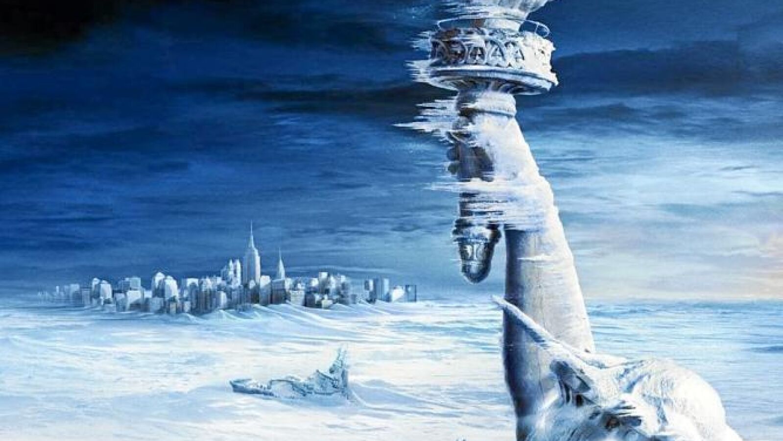 La primera vez que padeció a causa del cambio climático, con el que los ecologistas suelen amenazarnos periódicamente, fue en «El día de mañana» (2004), a causa de una tormenta y un monumental tsunami que inundan la megaurbe. La súbita bajada de temperaturas hace a los supervivientes patinar por la Quinta Avenida y contemplar estupefactos la Estatua de la Libertad asomar entre hielos polares.
