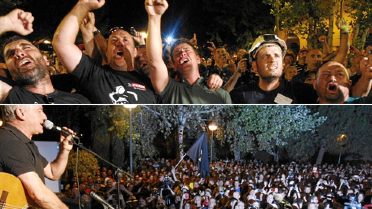 Así, el acto, que reunió a cientos de personas entre mineros –reconocibles por su camiseta negra–, jóvenes –no faltaron los «minis» de cerveza– y nostálgicos –algunos con antepasados mineros– tuvo sones de «canción protesta». Y es que cuatro eran los «cabezas de cartel»: Pilar Bardem y Willy Toledo por un lado, y Luis Eduardo Aute y Víctor Manuel por otro. Salvo Willy Toledo, que se ausentó a última hora –llegó incluso a ser invitado a subir al escenario–, fueron los nombres más vitoreados por los asistentes.