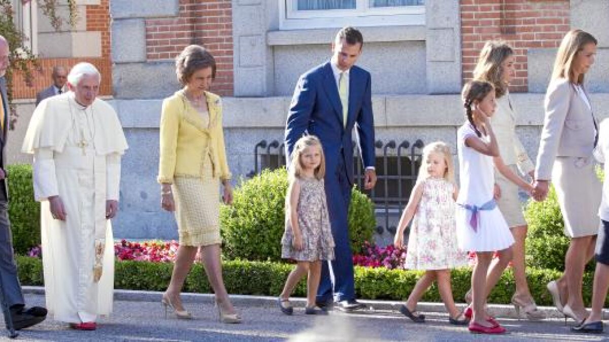 Benedicto XVI conversó unos minutos también con Don Felipe y Doña Letizia y tuvo gestos cariñosos con sus hijas. Durante el posado ante los fotógrafos, las Infantas Leonor y Sofía requirieron la atención de sus padres, y Doña Letizia no dudó en agacharse para escucharlas. Mientras, el Papa preguntaba al Monarca acerca del funcionamiento de la Casa del Rey y comentaron la organización de la Jornada Mundial de la Juventud.