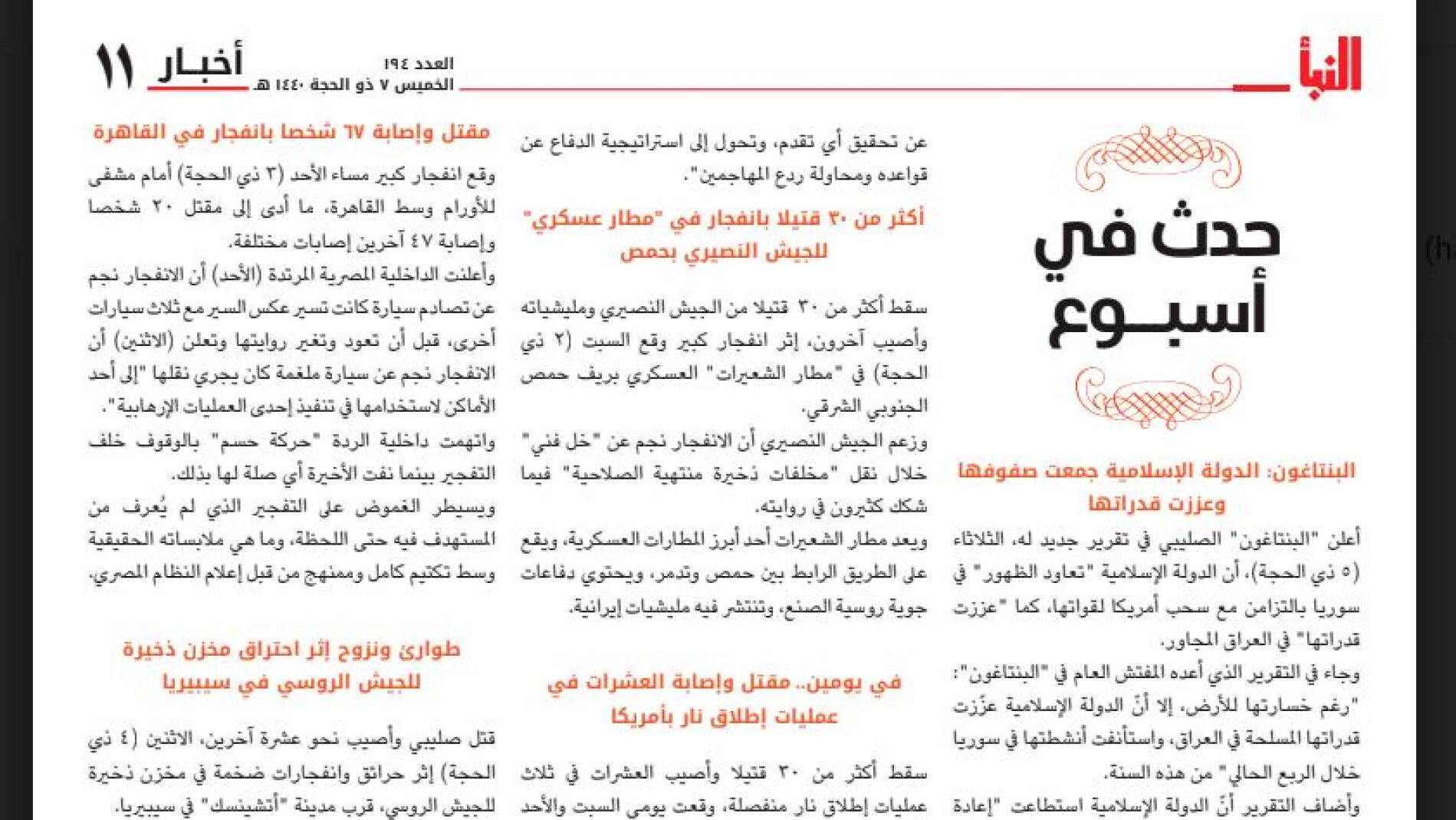 Daesh, en el último número de «Al Naba» se hacía eco, como una «gran victoria», del informe de «El Pentágono» en el que se admite el resurgimiento del grupo yihadista en Siria e Irak.
