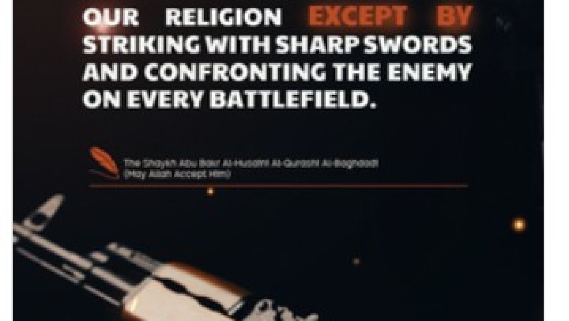 "Nunca recuperaremos nuestro honor y dignidad a través de nuestra religión excepto golpeando con espadas afiladas y enfrentando al enemigo en el campo de batalla". Para el Estado Islámico (Daesh, Isis) no basta co que los musulmanes sigan e Islam, sino que se tienen que apuntar al terrorismo yihadista que ellos preconizan y practican en diversos lugares del mundo.