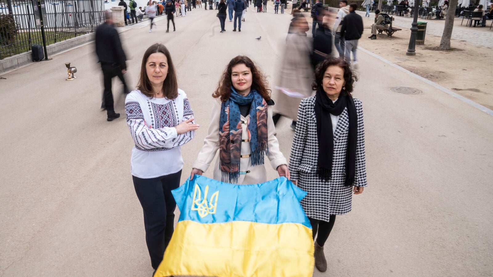 Olha, Inna y su hija Daria caminan tranquilamente por el Retiro. Aunque es invierno, el frío da un respiro y las temperaturas son anómalas. «El invierno es muy suave en comparación con Ucrania», dicen. Aunque sonríen, la expresión de sus ojos se vuelve triste cuando recuerdan a sus familiares que permanecen todavía en su país bajo la ocupación rusa, sobreviviendo entre bombardeos, cortes de luz y ataques de drones. Las tres llegaron a España cuando los blindados rusos empezaron a entrar en su ciudad, Járkiv, epicentro de los combates donde los tanques y las casas destruidas muestran la cara más destructiva de la guerra y del frente de batalla. Aunque Olha no conoce a las otras dos protagonistas de este reportaje, rápidamente empatizan al comprobar las similitudes de sus historias. Las tres están contentas en Madrid, pero, a medida que se enquista el conflicto, se enfrentan a nuevos desafíos en España. El principal: encontrar un trabajo fijo para poder vivir de manera autónoma.