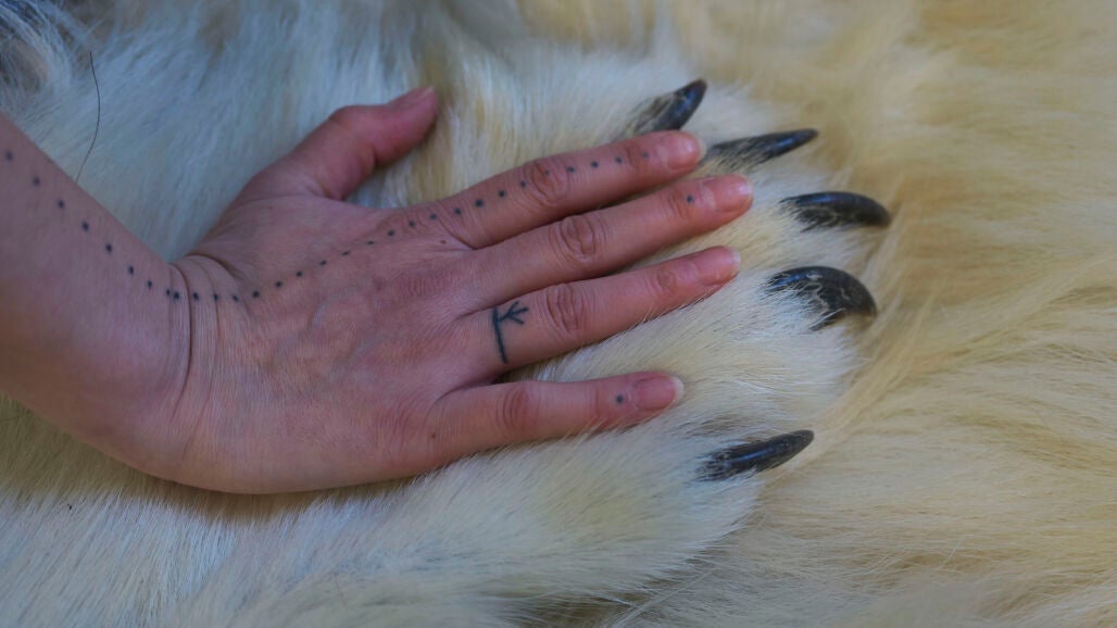 Sentada sobre la piel de un oso polar cazado por su familia, Aviaja Rakel Sanimuinaq dice que está orgullosa de formar parte de un movimiento de groenlandeses que están recuperando sus tradiciones y espiritualidad inuit.