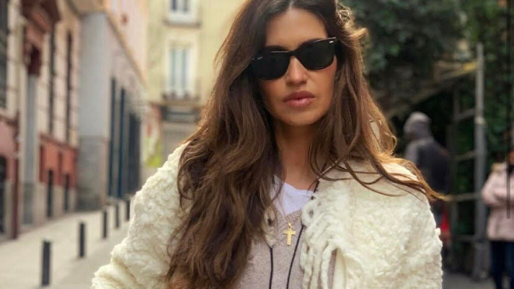 Un abrigo tipo cardigan largo con tejido suave de borreguito y detalle de flecos. Bolsillos laterales. Esta prenda no está forrada. Tejido realizado con fibras recicladas. Y Sara Carbonero lo ha combinado con un jersey de pico beige, camiseta blanca debajo, collares boho, vaqueros pitillos, cinturón de hebilla grande y las Converse negras favoritas de la periodista.