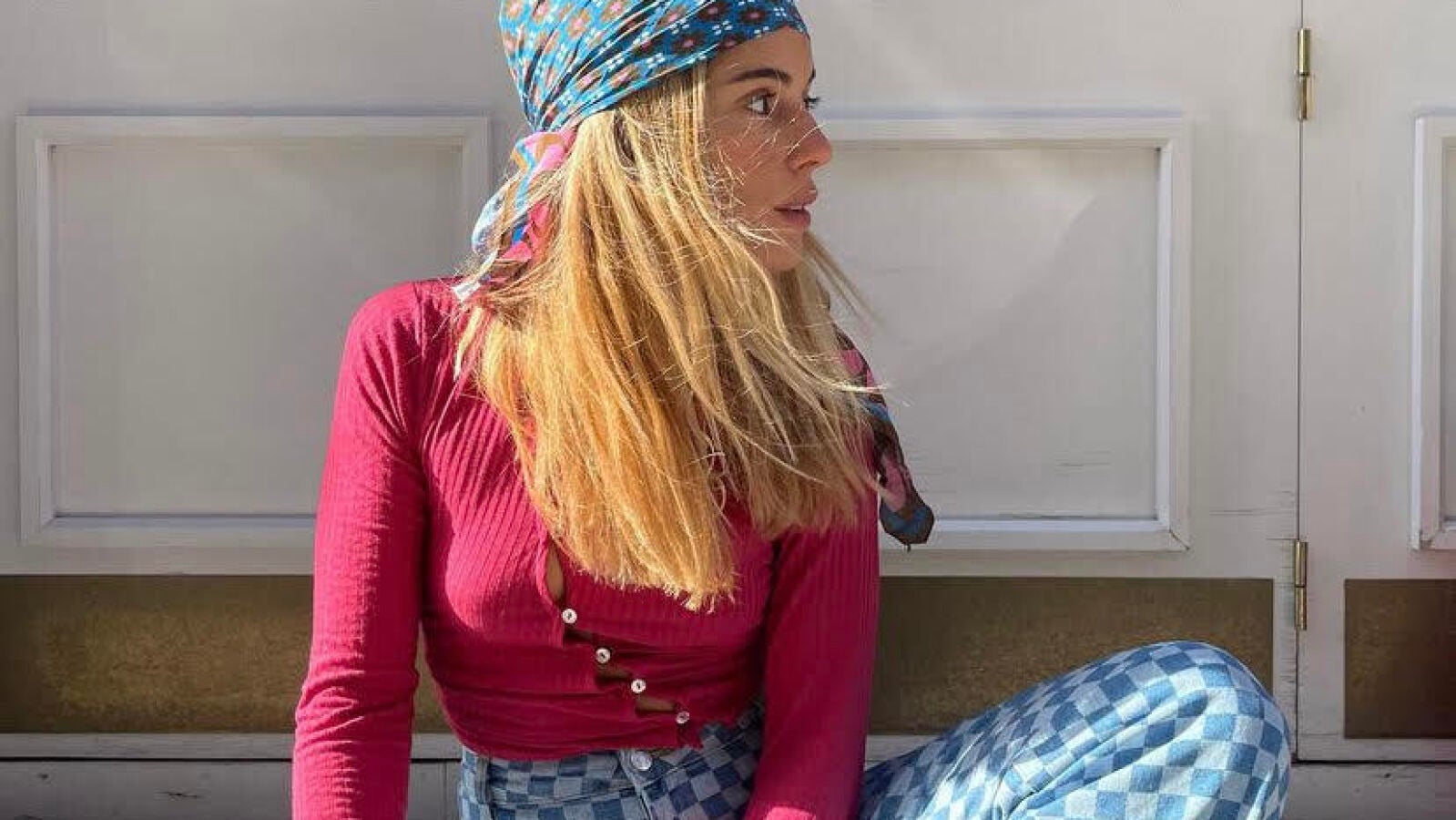 Y Sara Baceiredo los ha combinado de la manera más primaveral y hippie con un top rosa de canalé con escote con botones y un pañuelo en la cabeza para darle el toque más boho y colorido.