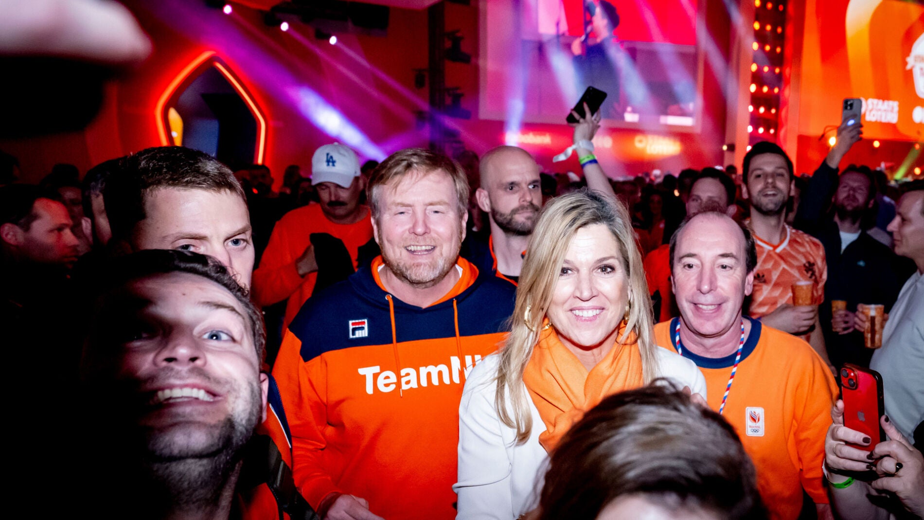 Las imágenes de la noche muestran a una Reina Máxima de Holanda sonriente, cercana y totalmente integrada en el ambiente. Nada de posados rígidos ni gestos estudiados: aquí hay espontaneidad, conversación, selfies y complicidad con los asistentes.
