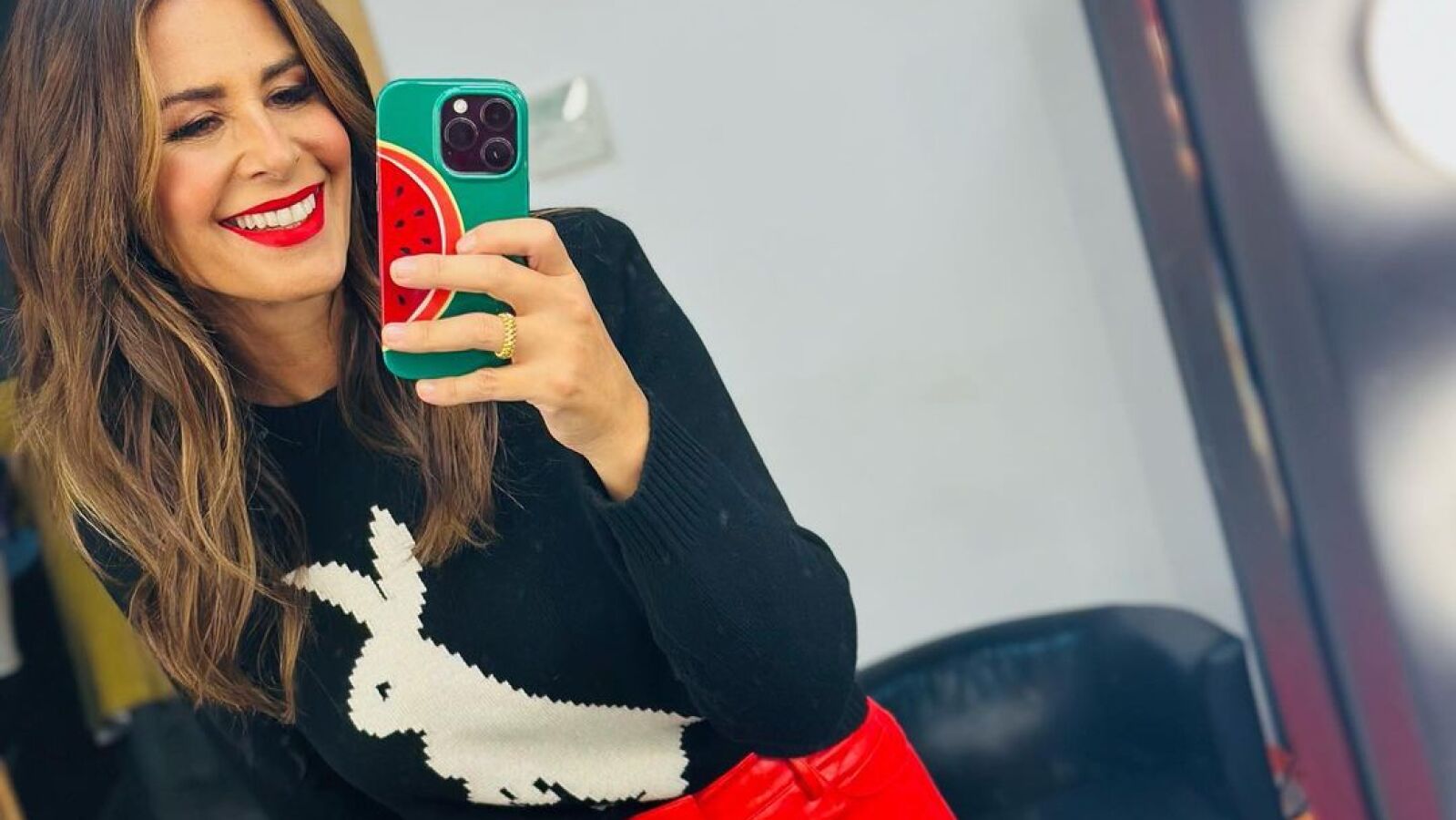 Unos pantalones de piel rojos de Nuria Roca que son de la firma Rotate, pero de la pasada temporada y están agotados en todas las webs. Lo que sí es de esta temporada es el jersey negro con dibujo de conejo blanco de Benetton.