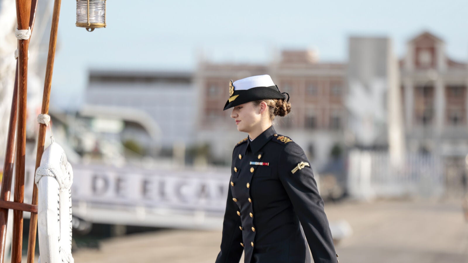 Para esta jornada tan importante, la Princesa Leonor ha lucido su uniforme de guardamarina, compuesto por una chaqueta y pantalón azul marino y gorro blanco, el conjunto de su formación actual en la Academia Naval.