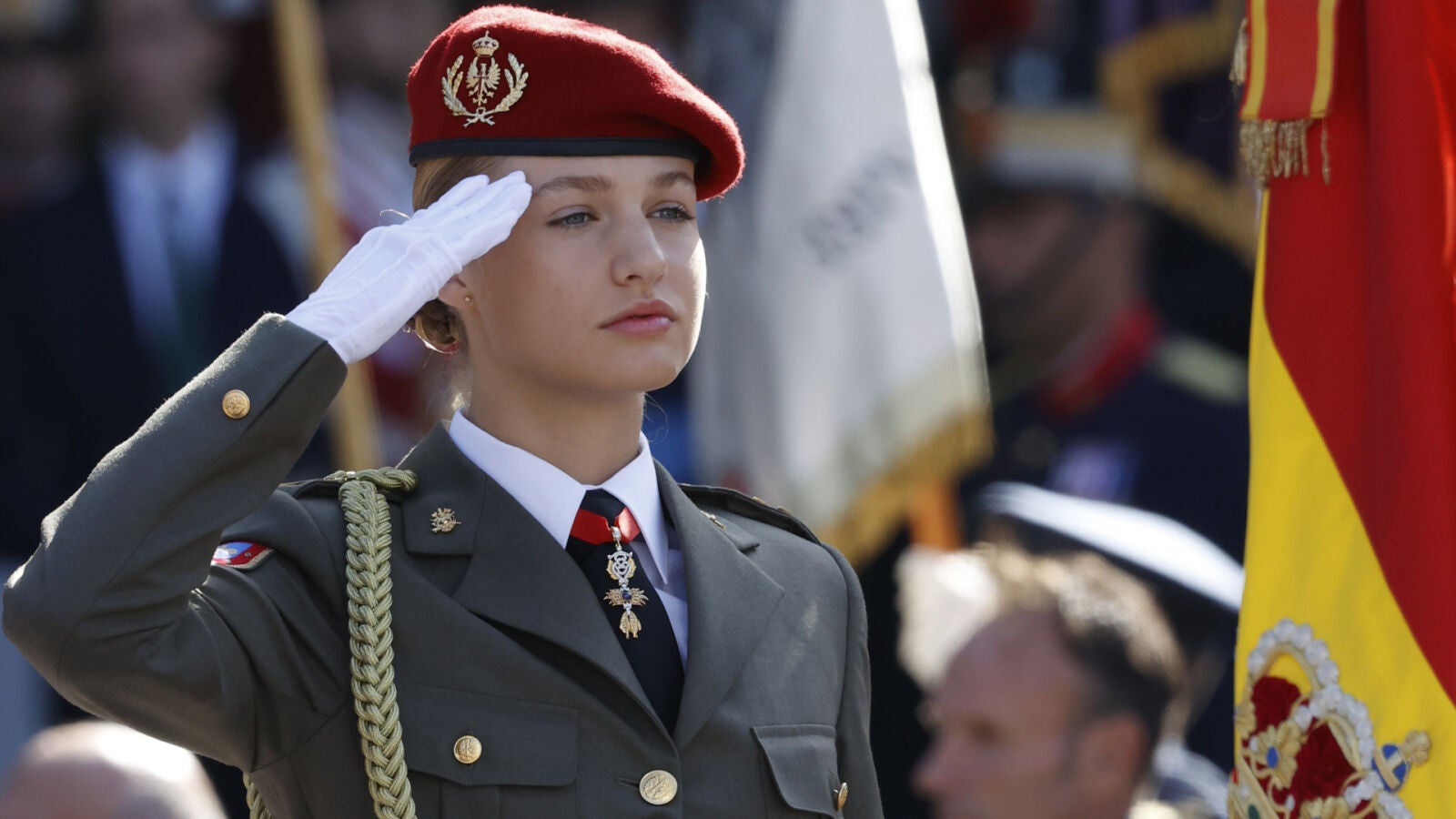 Para presidir este desfile de lo más importante, la Princesa Leonor ha lucido el uniforme de gala del Ejército de Tierra, compuesto por un traje de color caqui con camisa blanca y cordones dorados, ya que los de color rojo son los que utilizan a diario. Al ser aún estudiante, ha llevado una boina roja en la cabeza, en lugar de la denominada “gorra de plato caqui”. Según las normas de uniformidad reguladas en una orden ministerial de Defensa aprobada en 2016, la Princesa Leonor tampoco ha llevado el fajín azul del Estado Mayor, sino un ceñidor de gala dorado.