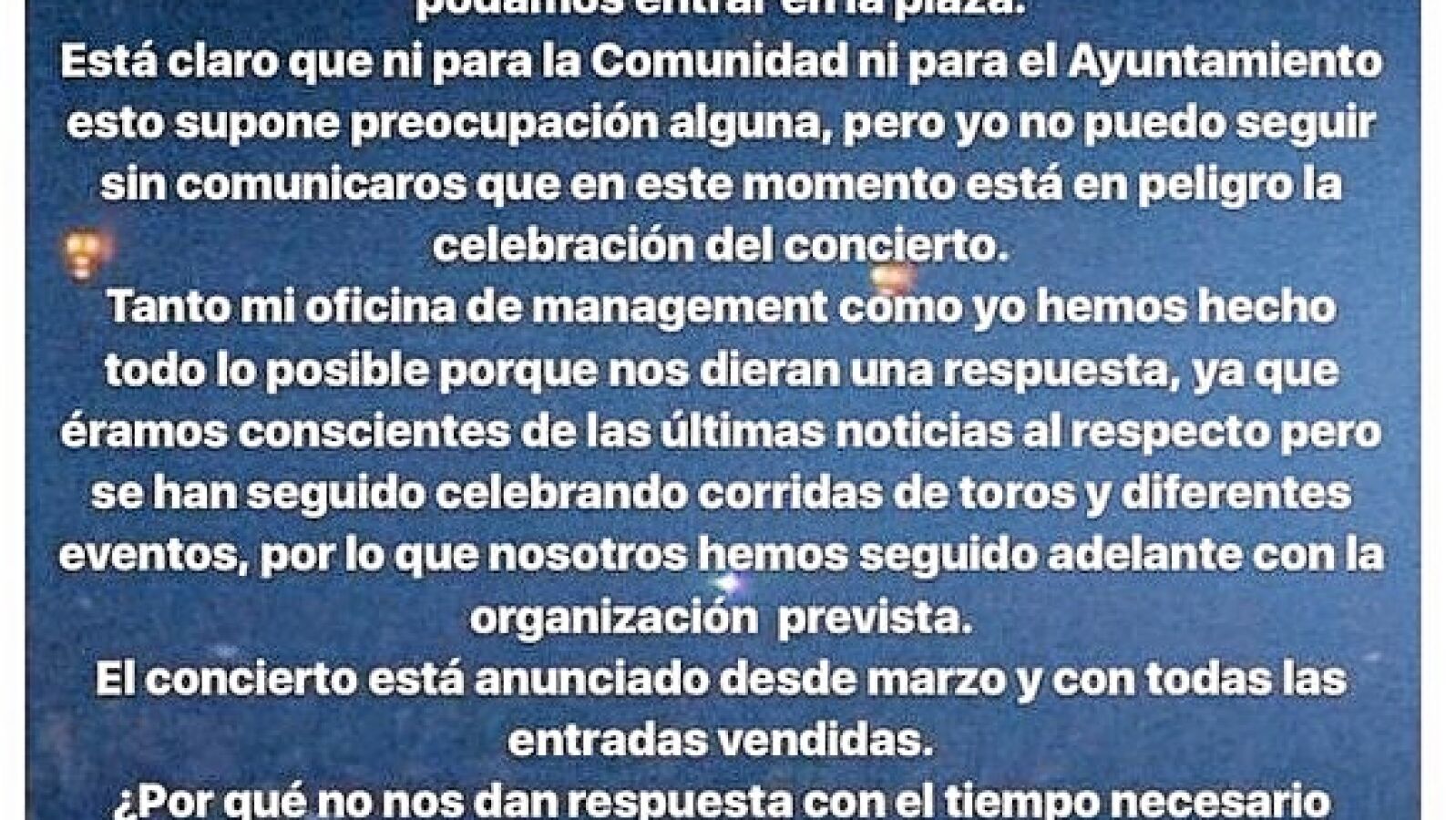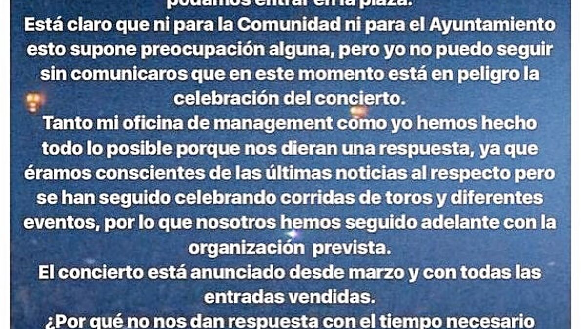 Los propios cantantes tampoco eran ajenos a la posibilidad de que no se diera el visto bueno a sus conciertos. Vanesa Martín también se quejaba horas antes de decretarse la suspensión desvelando que los rumores de que podía denegarse el permiso existían desde verano: «Llevamos varios meses de rumores que no hacen más que aumentar la incertidumbre de si finalmente se podrán llevar a cabo conciertos y eventos no taurinos en la plaza».