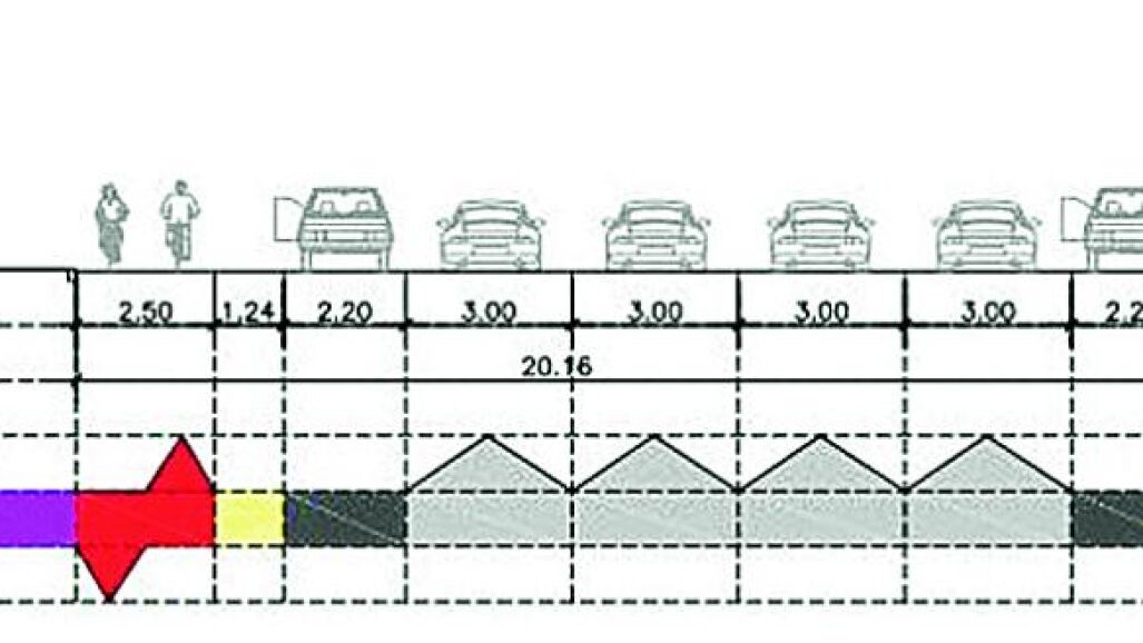 Otra de las nuevas soluciones del Gobierno de Carmena es la instalación de carriles de dos direcciones para los ciclistas. Estos diseños, según las asociaciones, reducen el ancho mínimo de seguridad. Además, multiplicarán el peligro para los viandantes ya que cruzan hasta 27 pasos de peatones. En la imagen, la propuesta para la instalación de un carril bidireccional (en rojo) en la calle Santa Engracia.