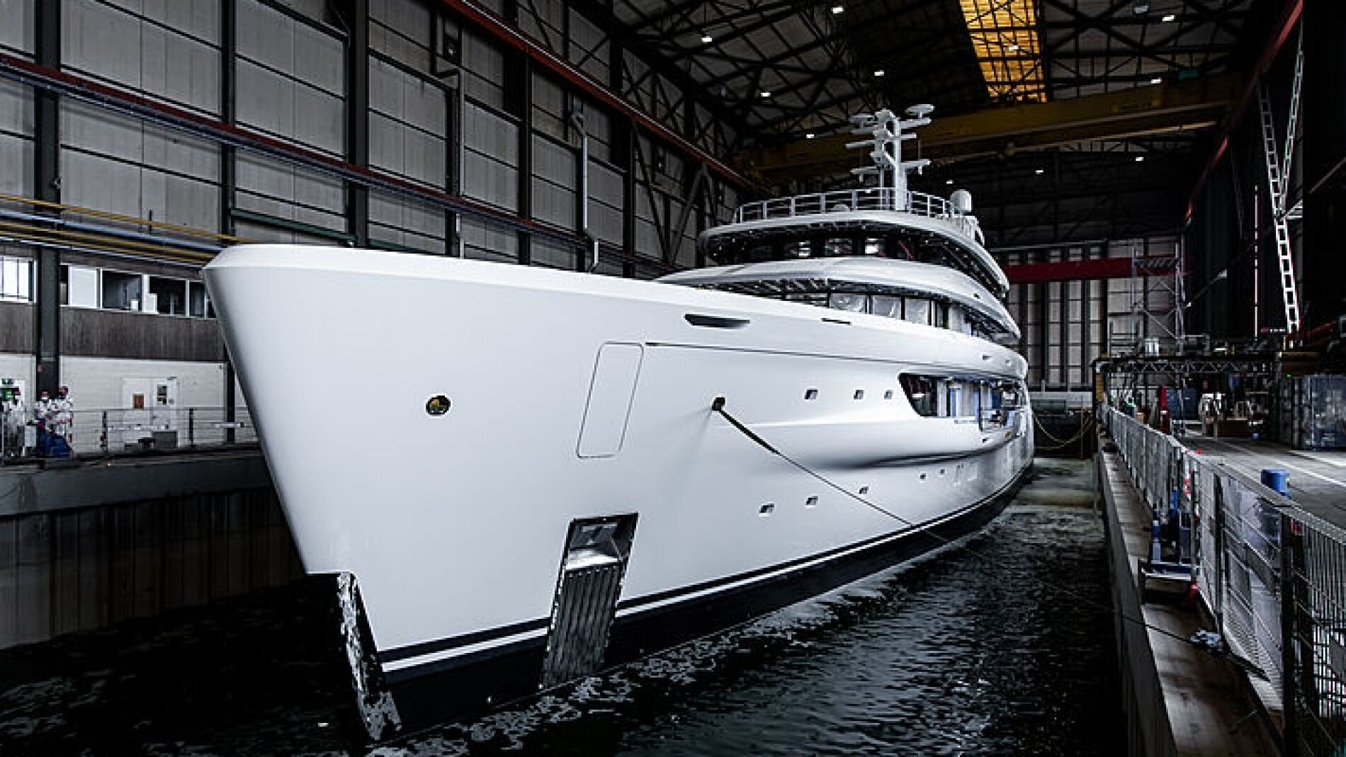 El súper yate Amels, de 78 metros de eslora, por fin toca el agua