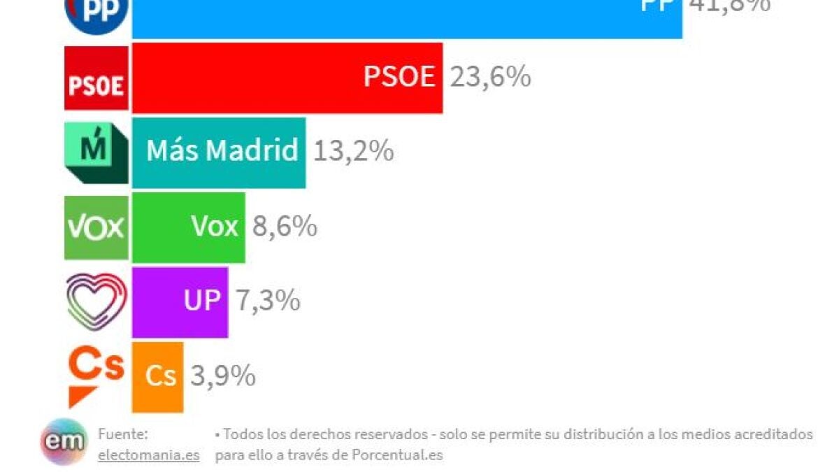 Según la última actualización del compendio de encuestas de Electomanía, Ciudadanos estaría cada vez más lejos de entrar en la Asamblea y tendría un 3,9 por ciento de los votos, el valor más bajo de las últimas semanas. Necesita un mínimo del 5 por ciento para entrar en el reparto de escaños. Más Madrid es la otra fuerza que aumenta en intención de voto, apenas 3 décimas, mientras que el PSOE sigue perdiendo espacio electoral al igual que VOX y Ciudadanos.